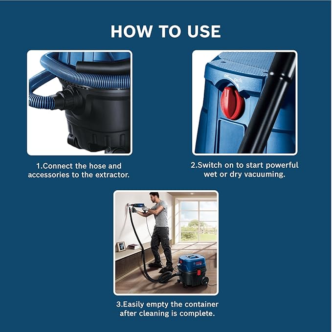 - Extended Filter Life – This extractor tool has the large surface pre-filter enhances main filter longevity, minimizing maintenance downtime and maximizing productivity for BOSCH Professional users.