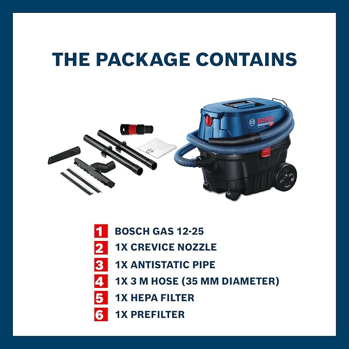 - Consistent Suction Power – BOSCH GAS 12-25 Professional delivers 1250W high-performance suction with patented BOSCH filter cleaning technology for uninterrupted wet and dry extraction on job sites.