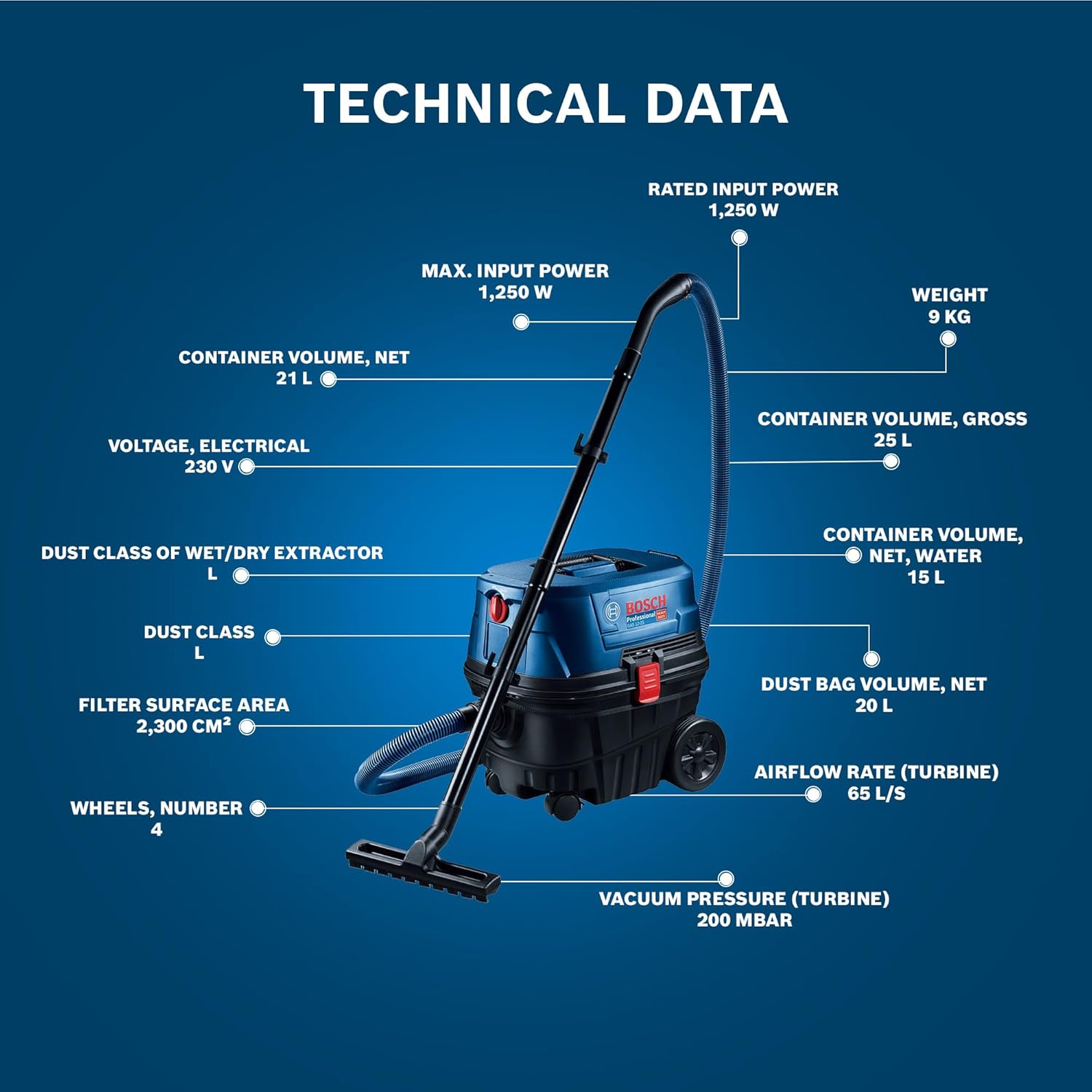 - Spacious Container Capacity – This BOSCH tool has 25L gross and 21L net capacity effortlessly handling both wet and dry debris, making it ideal for workshops, renovations, and construction sites.