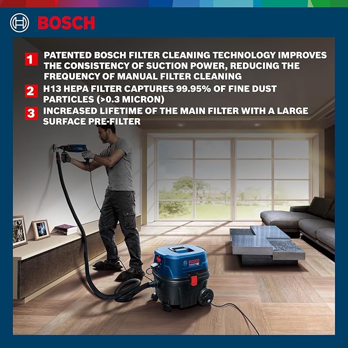 - HEPA Filtration – Equipped with H13 HEPA filter, this BOSCH vacuum captures 99.95% of fine dust particles (>0.3 micron), ensuring cleaner air and a healthier workspace.