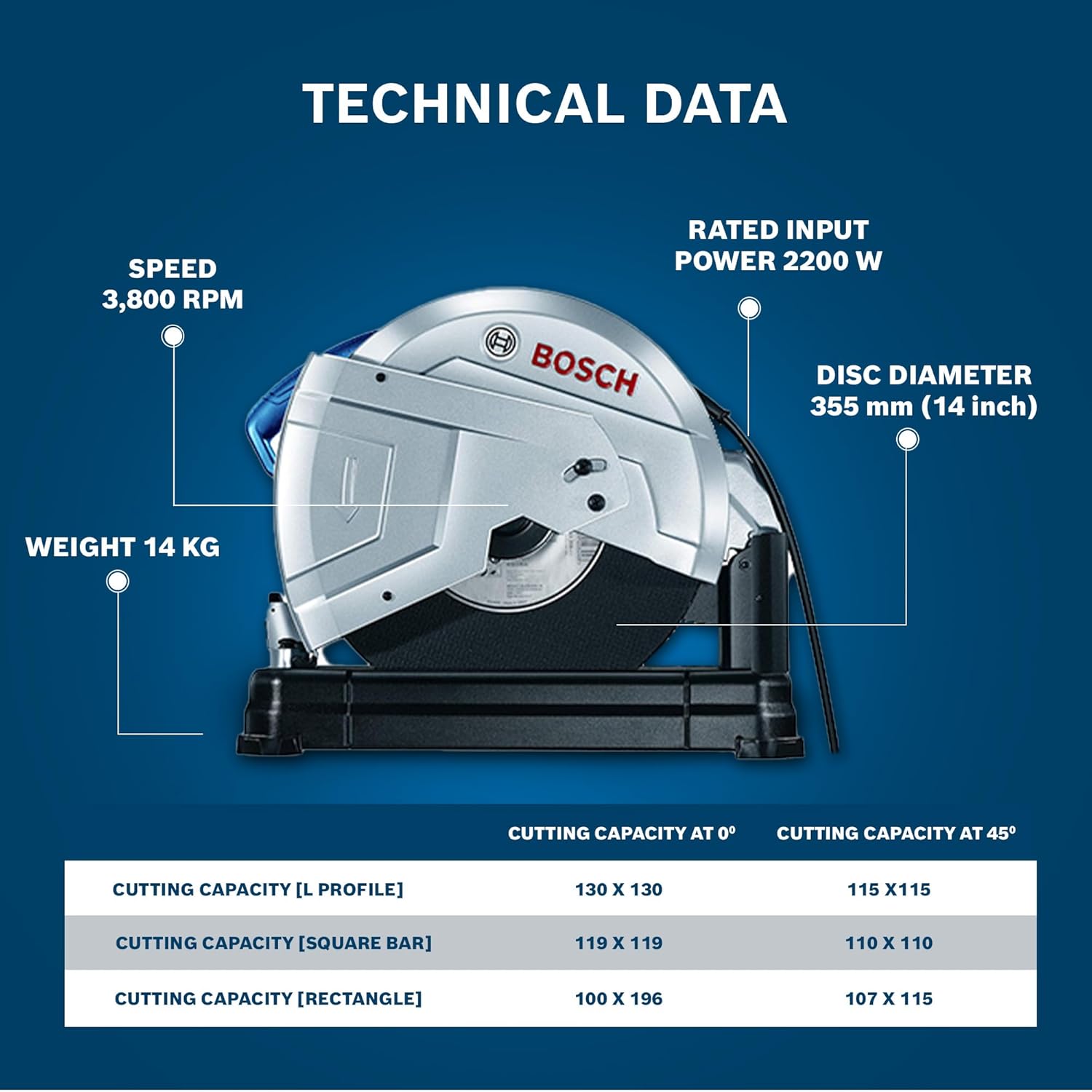 - Cutting Capacity: These specifications highlight the versatility of the BOSCH GCO 220 CHOP SAW in handling various shapes and sizes of metal materials, making it suitable for a range of cutting tasks. Cutting capacity rectangle 100 × 196 mm, cutting capacity square 119 × 119 mm, cutting capacity round 129 × 129 mm, Cutting capacity L-profile 130 × 130 mm.