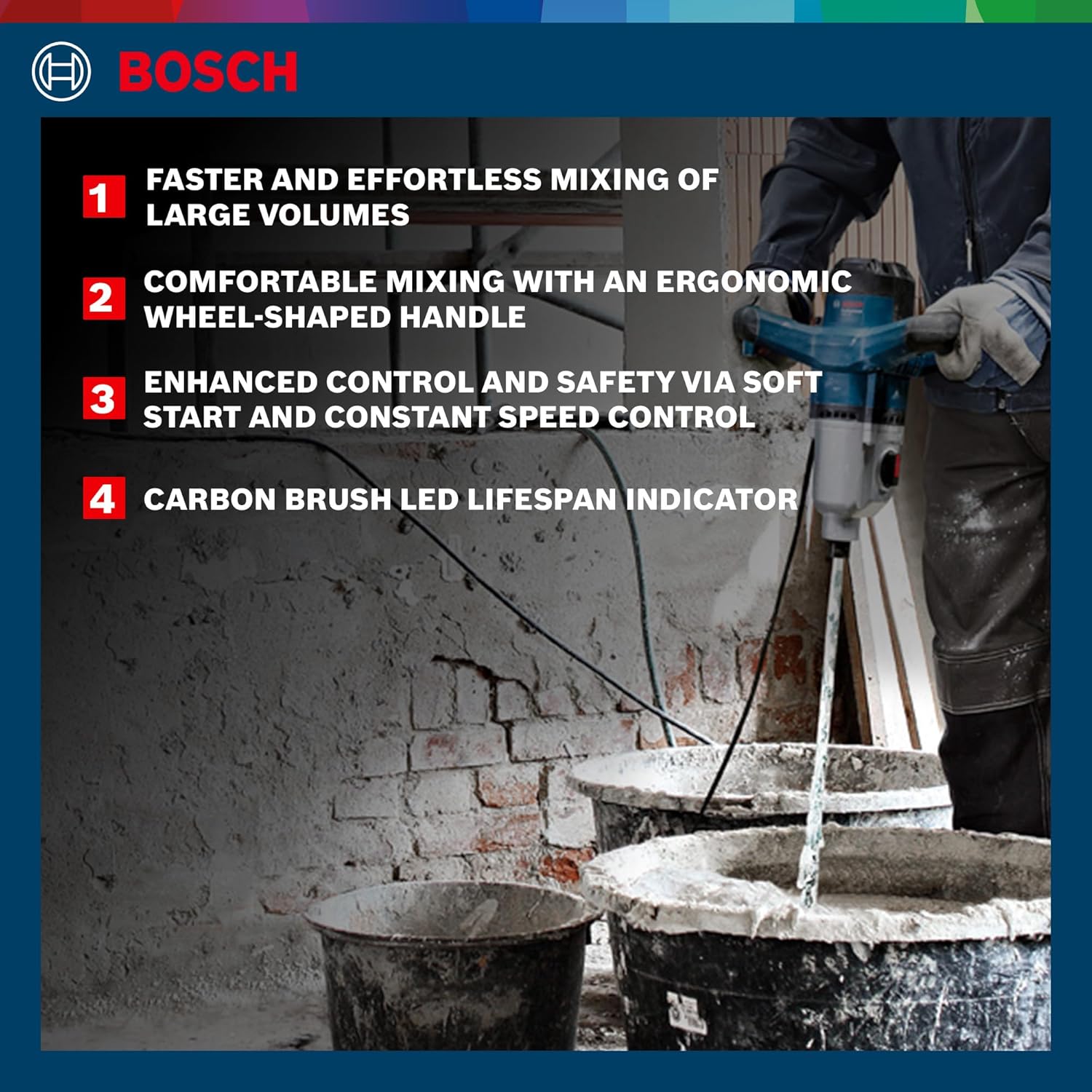 - High-Performance Motor for Effortless Mixing: Equipped with a powerful 1400 W motor, the Bosch GRW 140 ensures faster and effortless mixing, even for large volumes of paint, cement, putty, plaster, or other building materials.