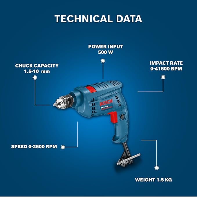 - Speed and Impact rate: The GSB 10 RE Corded-Electric Drill machine offers a no-load speed of 0-2600 RPM catering to various tasks. It has an advanced impact mechanism with an