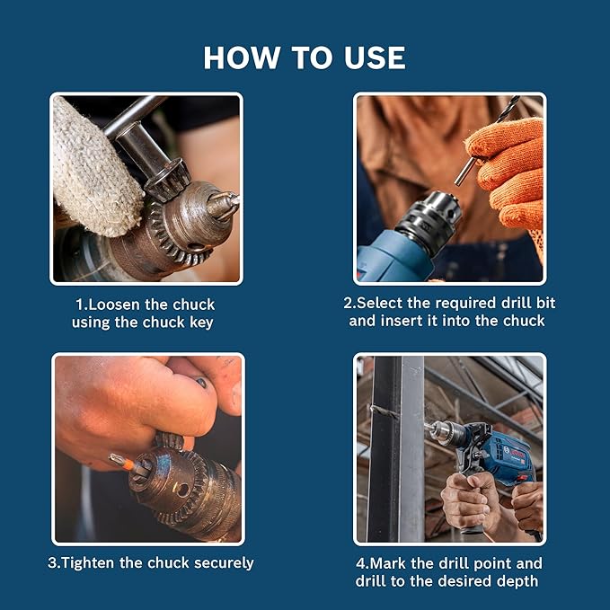 - Drill Bits & Chuck Capacity: This all-purpose collection includes specialized drill bits for your projects: 20 mm for wood, 10 mm for masonry, and 8 mm for steel. Wood bits create precise holes, masonry bits easily penetrate concrete and brick, and metal drill bits ensure clean cuts in various metals. The chuck capacity is 0-10 mm, accommodating a wide range of bit sizes.